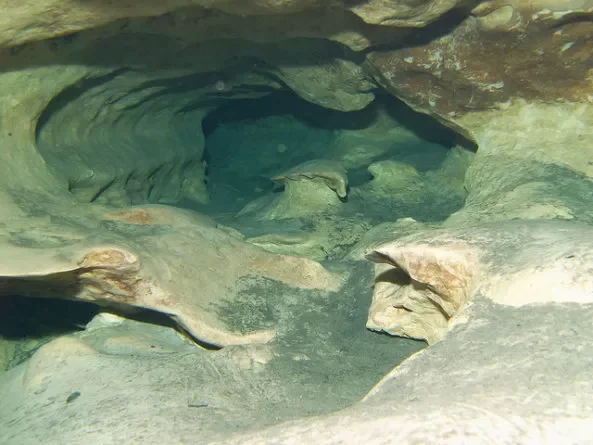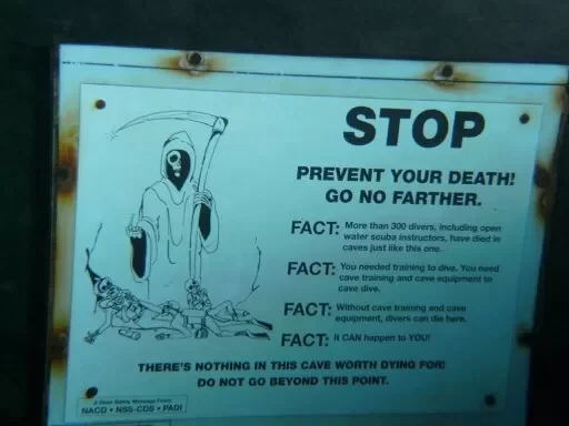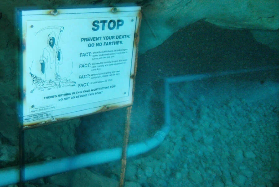 洞穴入口位于水面下50英尺处,从这里开始,一条狭窄的通道延伸向黑暗的深处。在洞穴入口处,一块令人毛骨悚然的标志牌警告着潜水者:“止步。前方无物值得以生命为代价。“标志牌上画着死神,骷髅手指着前方——这是对那些想要进入洞穴者的最后警告。